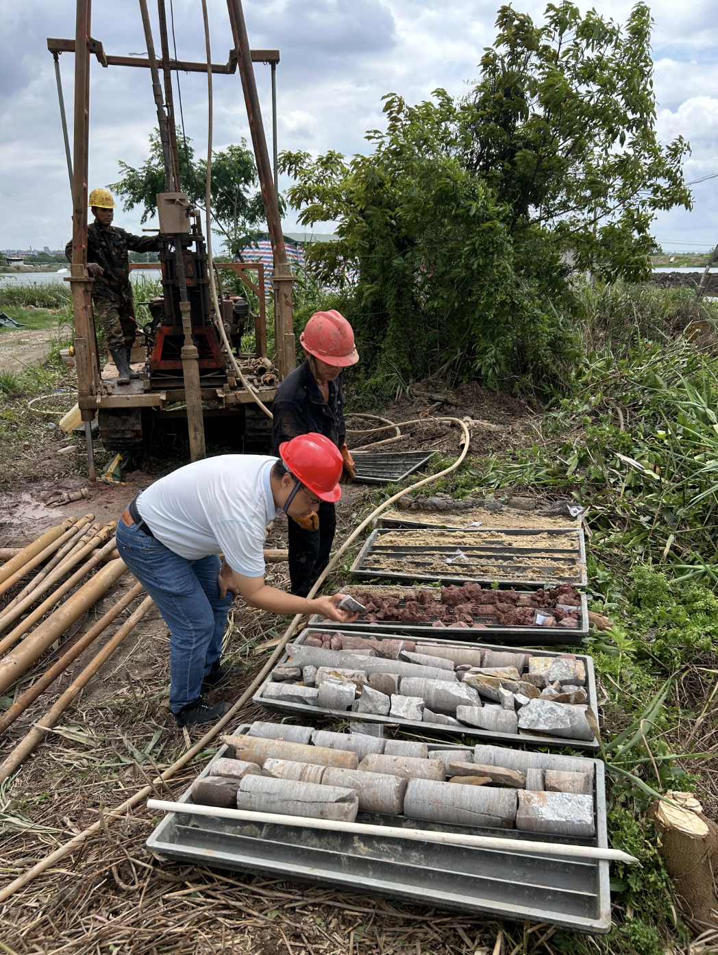 工作人员在钦州市钦南区老涠村监测站点开展钻探工作检查。广西地质环境监测站供图